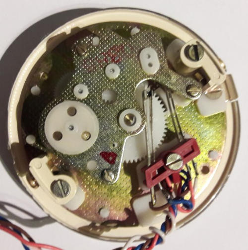 L.M. EricssonDer Boden des Designerstücks “Ericofon” besteht zuerst einmal aus Wählscheibe mit Schaltwerk.Die Anordnung der Ziffern dieses Exemplars ist etwas speziell und war einige Zeit lang üblich in Schweden und Dänemark. Die Ziffer 0 produziert hier genau einen Impuls, alles ist um eins verschoben. Die Benützung in unseren Systemen funktioniert klaglos, erfordert aber rechnerische Aufmerksamkeit.Das Schaltwerk verwendet eine ähnliche Bremstrommel wie das Schweizer Sodeco-Modell. Der Impulskontakt hingegen wird von einem Flügelrad betätigt. Ein separater elektrischer Kontakt dient der Vermeidung des überzählige Wählimpulses. Dieser Kontakt ist stromkreismässig dem Impulskontakt parallelgeschaltet, öffnet beim Aufziehen der Wählscheibe und schliesst kurz nach Ablauf des letzten Schrittes.